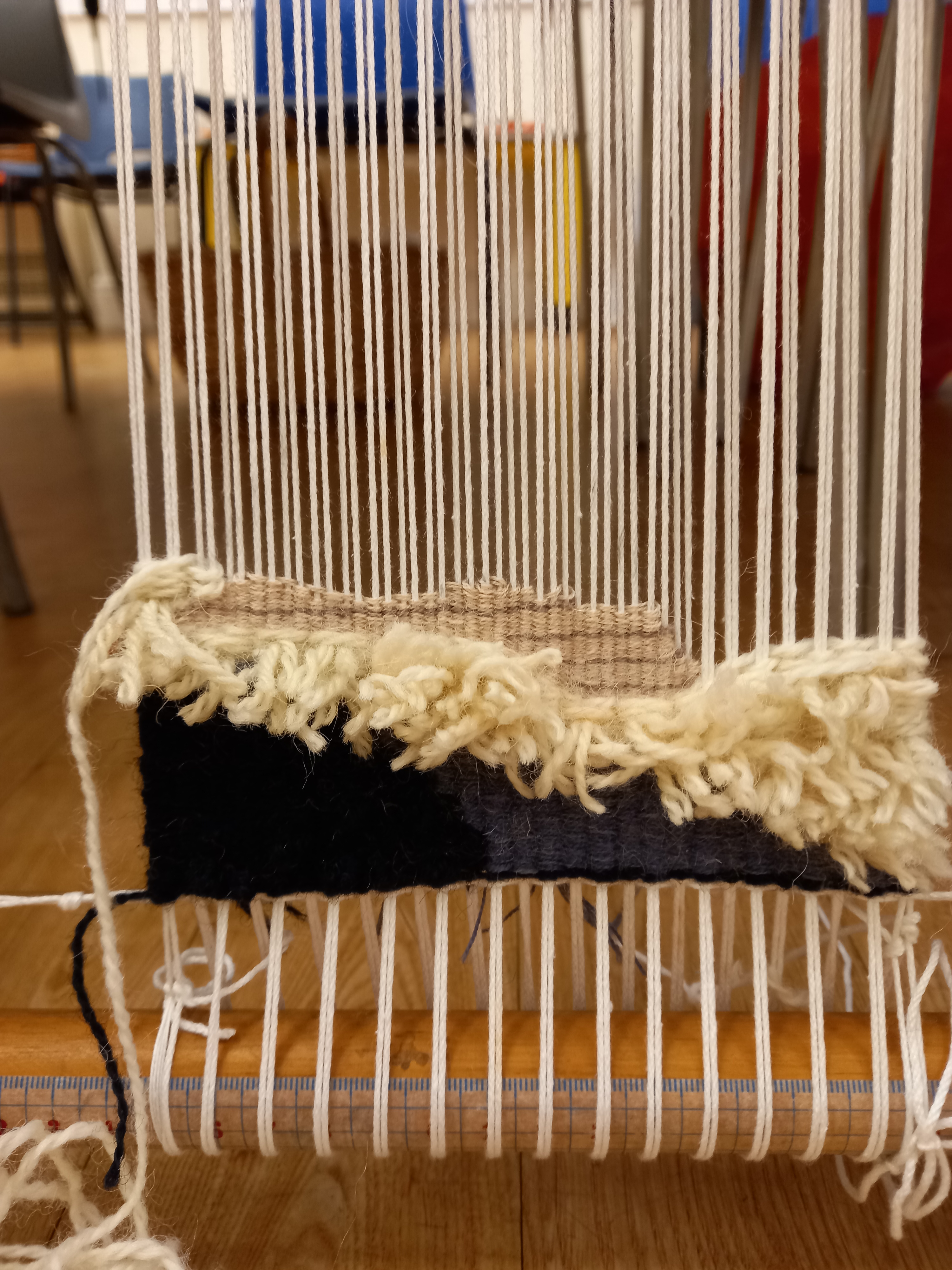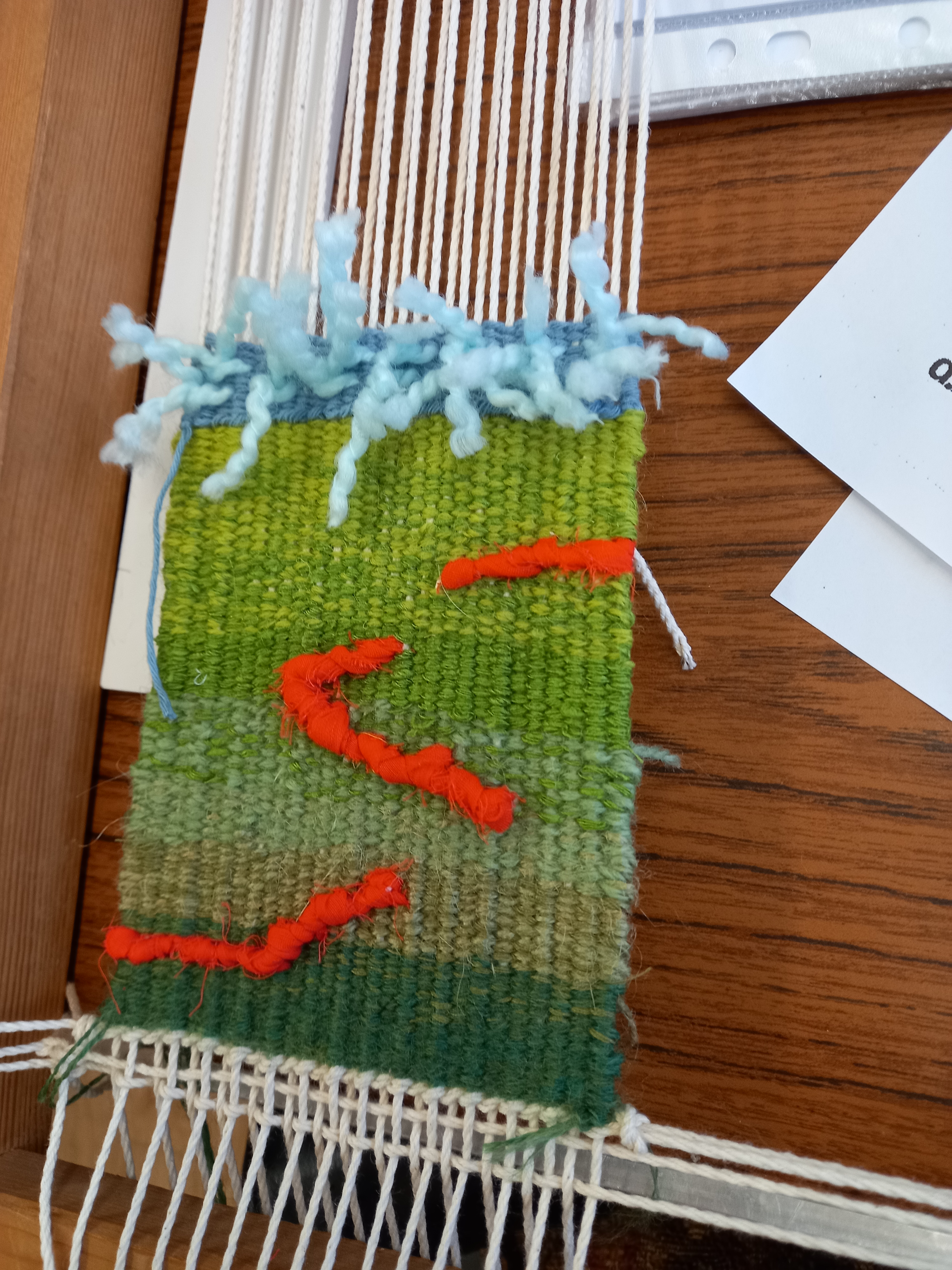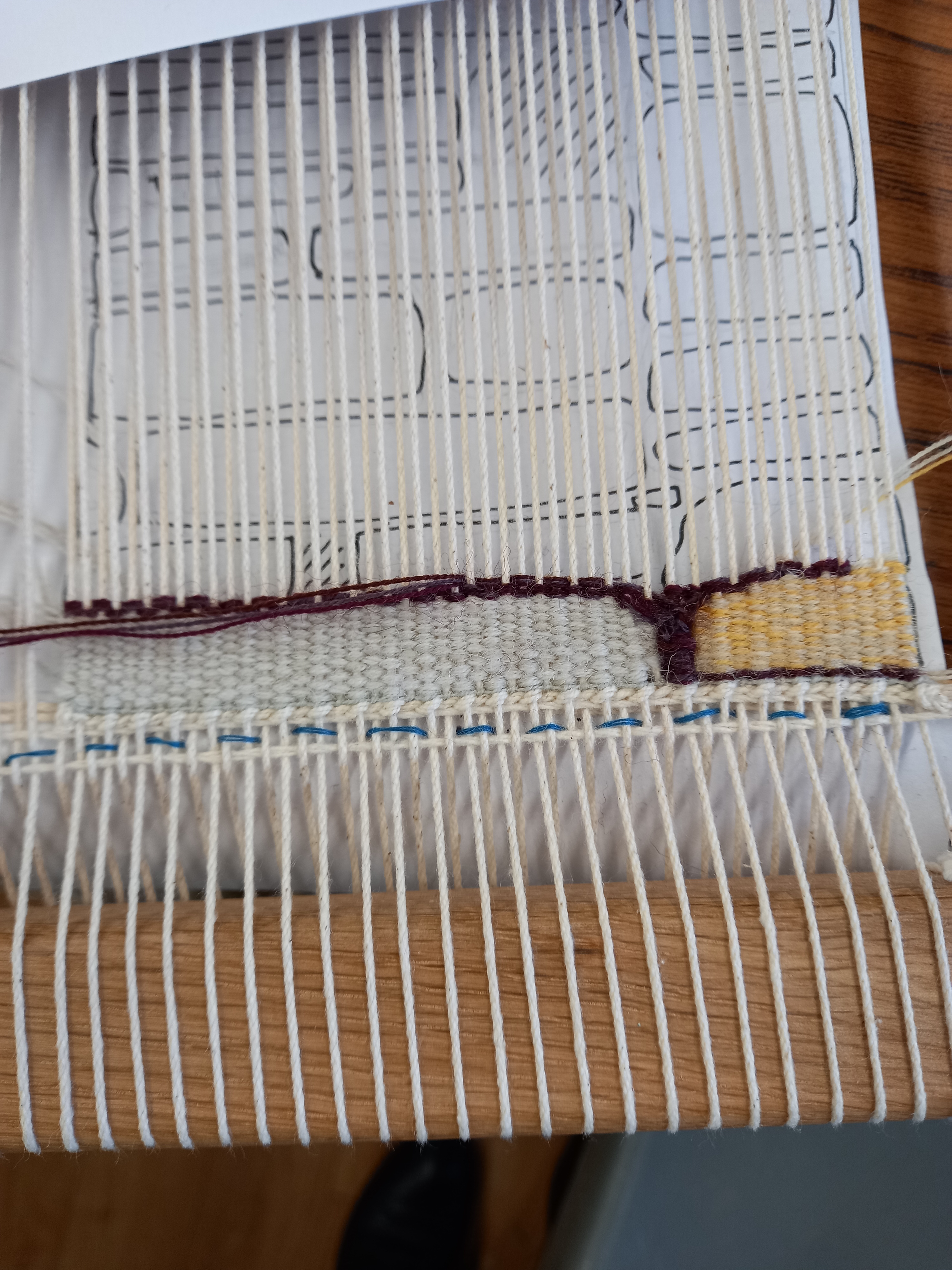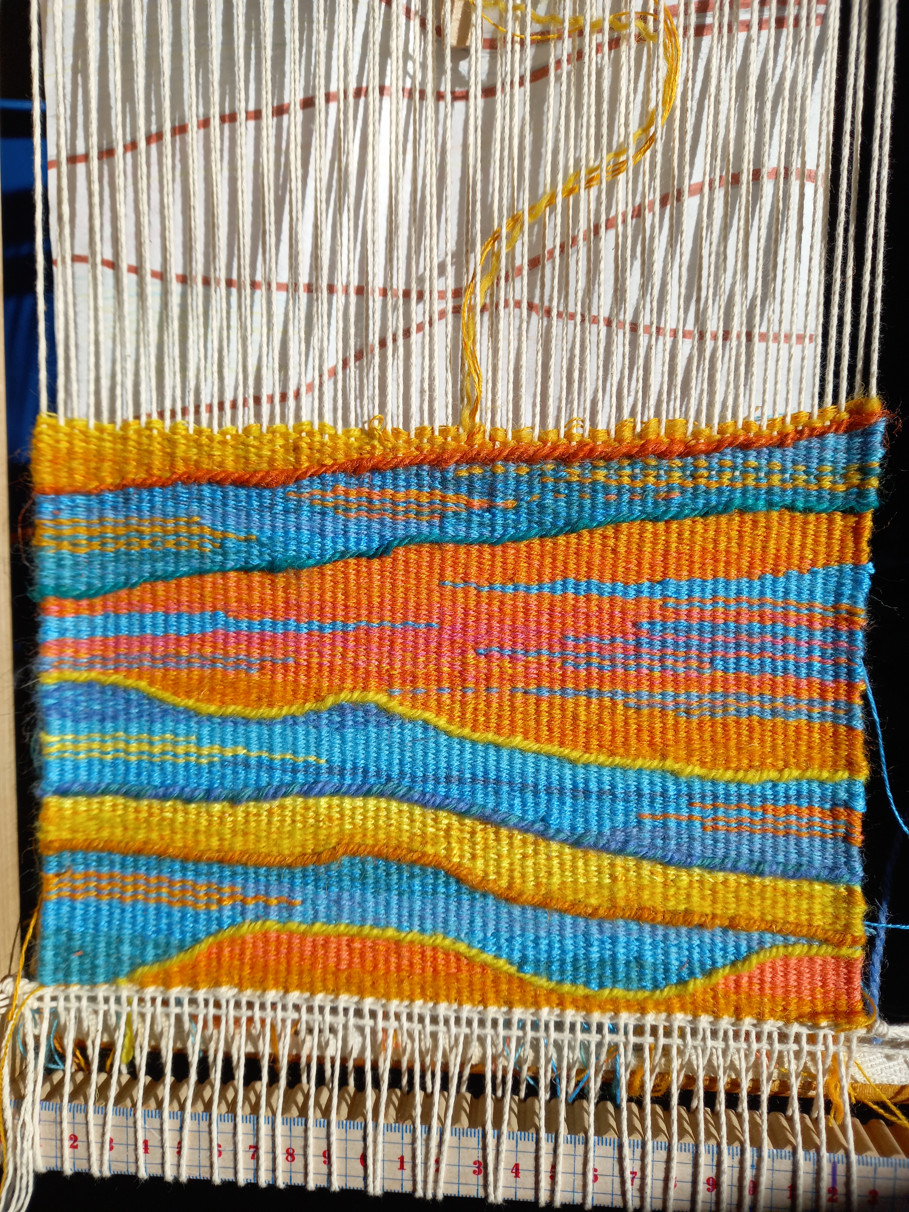 Anne attended an inspiring 3 day Tapestry Workshop organised by Tawe Guild with Tapestry Weaver Jane Brunning, learning a variety of tapestry weaving skills and design techniques. It is a slow yet mindful process, which allows for creative expression : exploring different forms, colour, and texture.The tapestry “Skyscape” was the result.