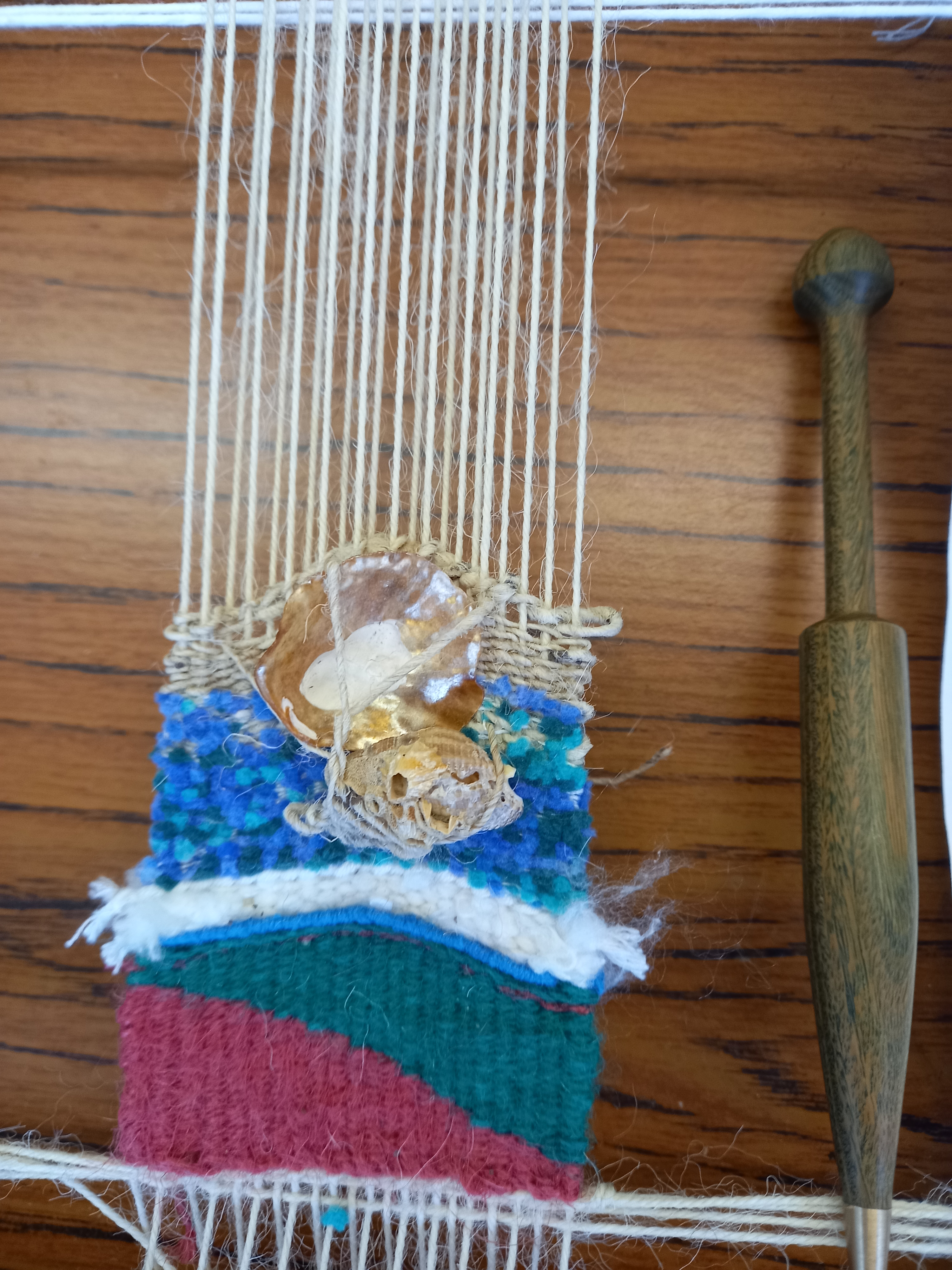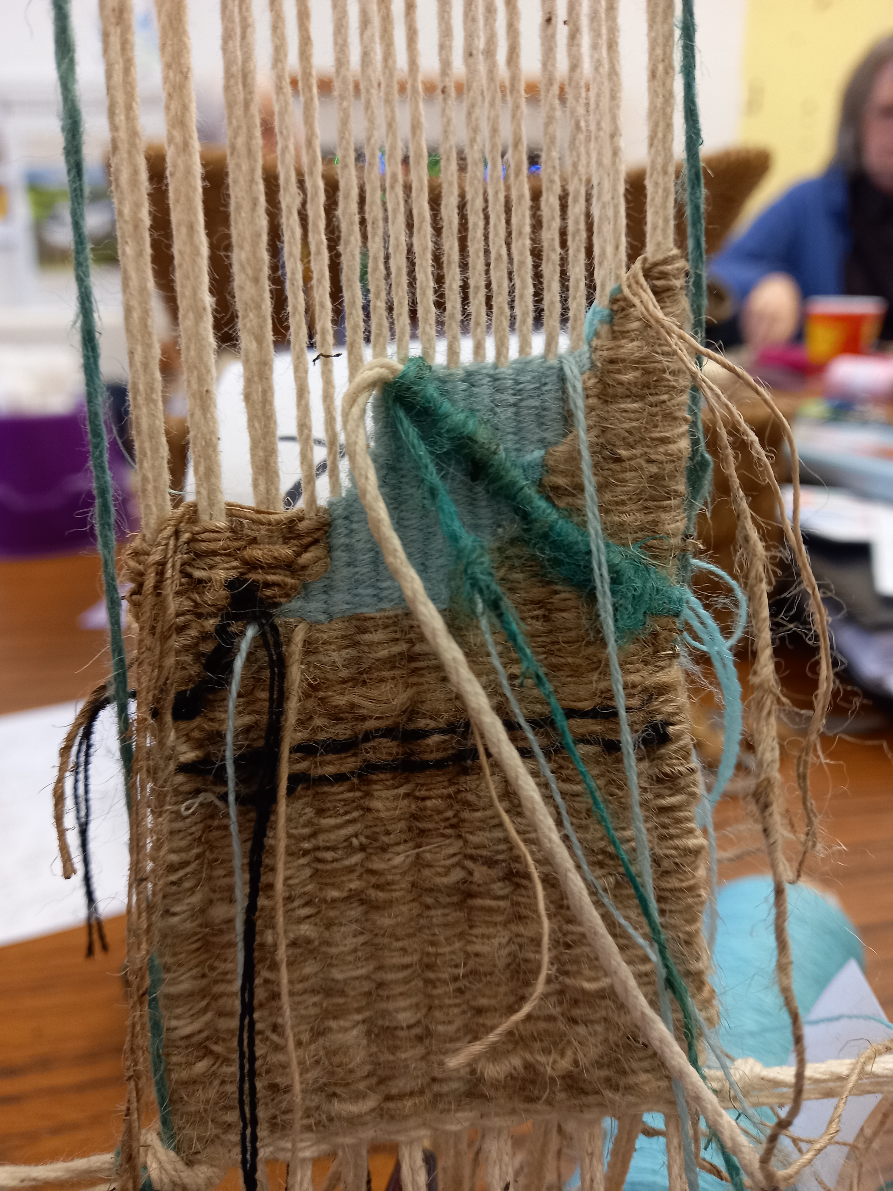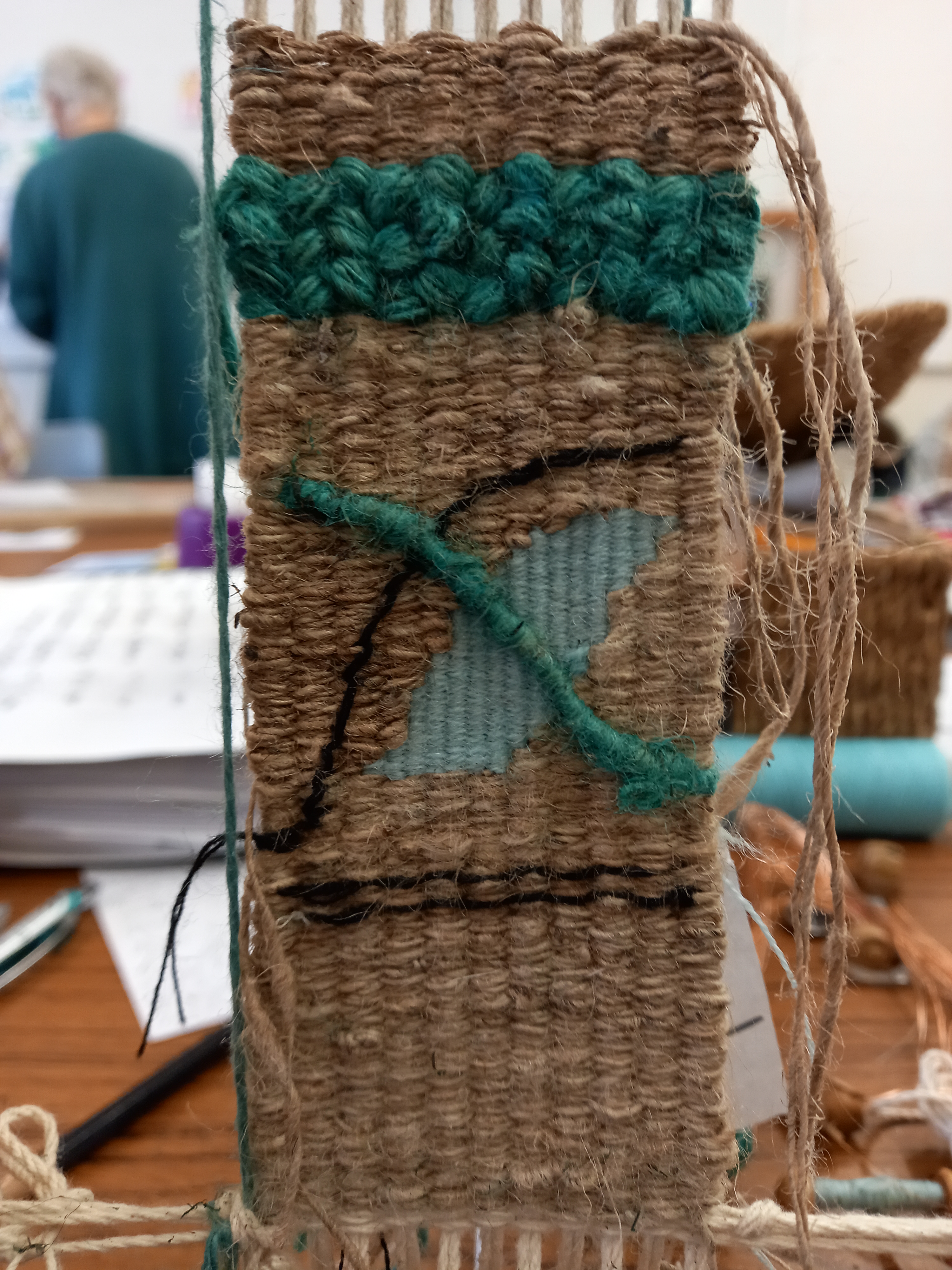 The next two days were taken up working both practise and final pieces. It is amazing how little one can achieve in quite a long time! The work is slow and meticulous and Jane frequently showed us new stitches and methods we could use, outlining, wrapped stitches and inserting objects. It was great that both newbies and experienced tapestry makers had something to learn and we could get as involved in learning new processes as much or as little as we liked.