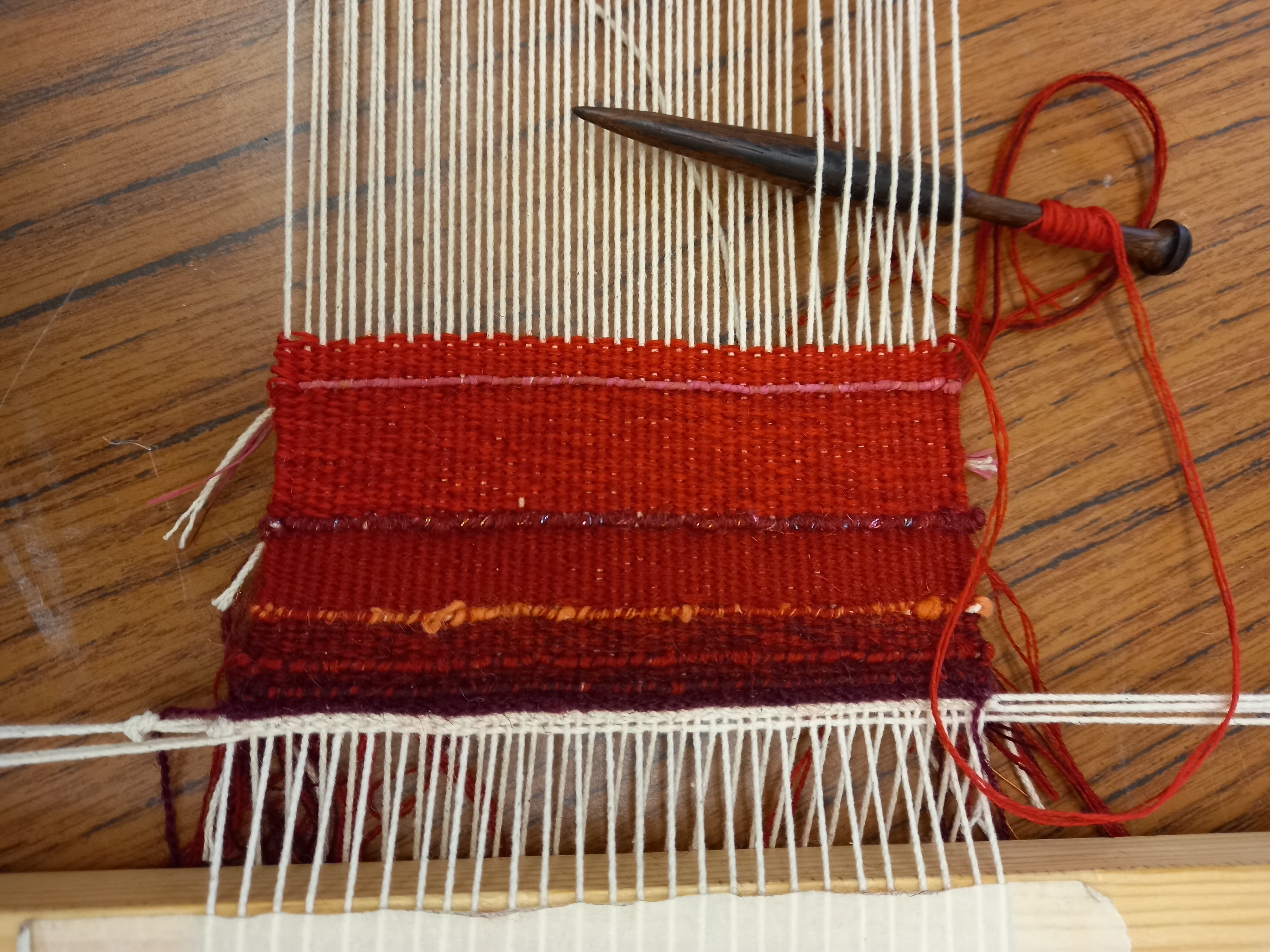 Participants started by creating warp ideas using wraps with three colours of woollen yarn. Over four days they then learnt how to make a warp and dress the loom; weave a plaid design; develop their weaving inclusions and clasped weft; finished the work with fringing. There was much to fit in but it was a great course and the finished weaving was excellent.