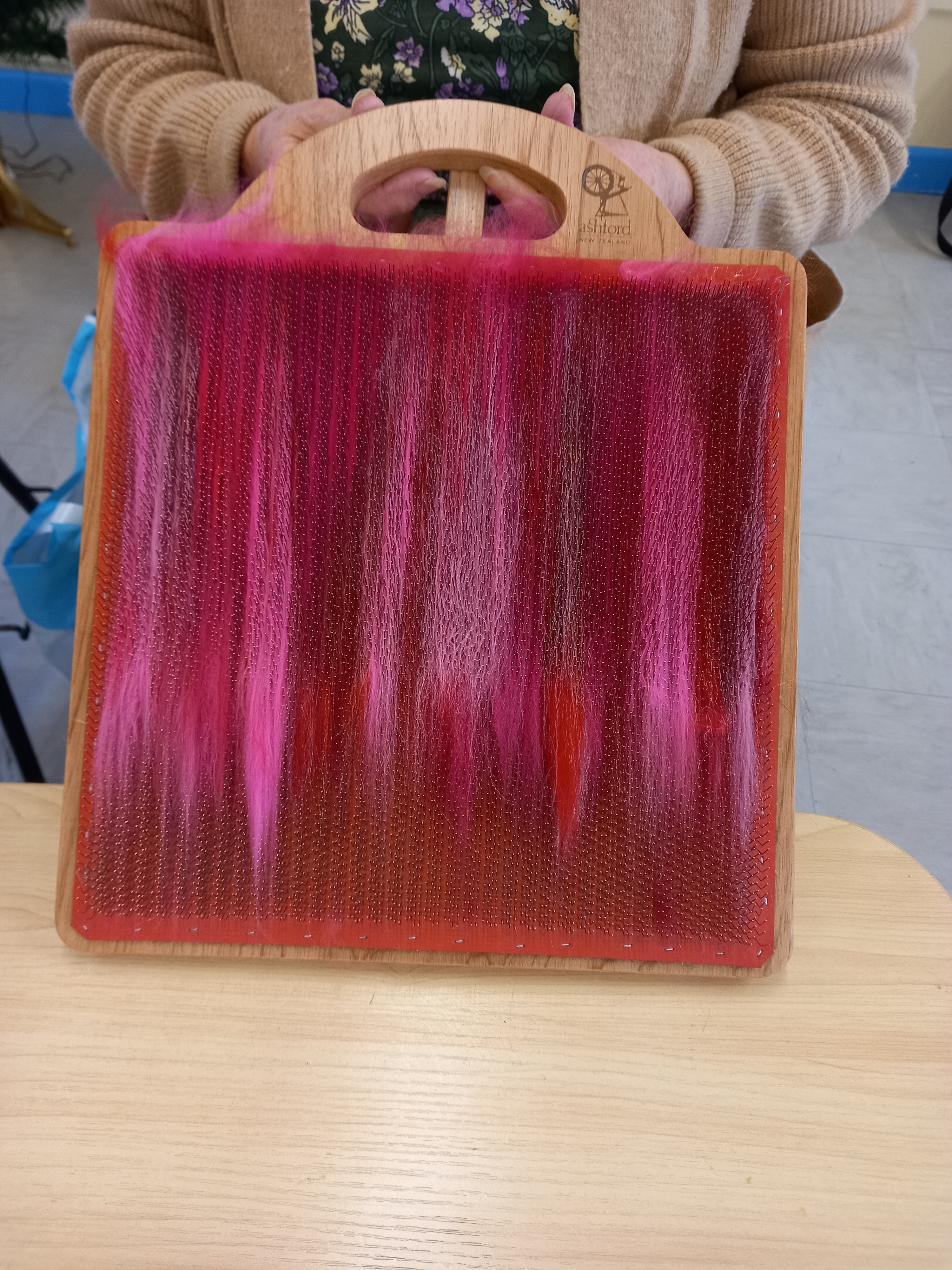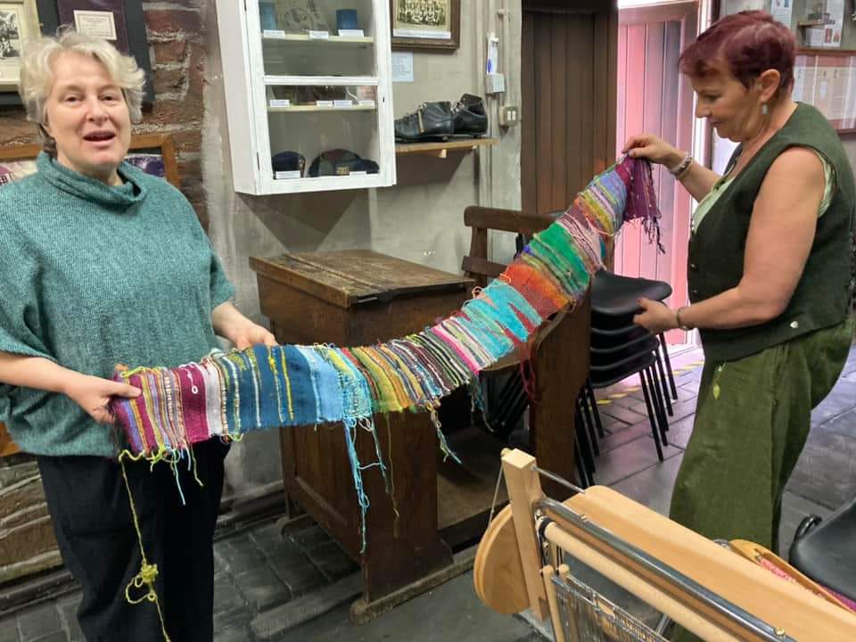 This is the group who took part in the recent rigid heddle workshop at the Dove Workshop, Banwen, weaving a festive table runner. It was an enjoyable day and everyone produced a colourful finished fabric.