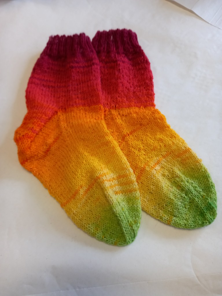 Quite a long time ago, certainly before Covid, Sal and Sandra ran a dyeing workshop on sock blanks. Anna has finished her sock which are gorgeous. Some of our guild projects take longer than others but the results are certainly worth it!
