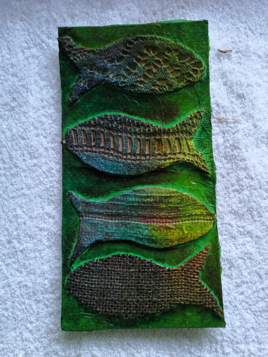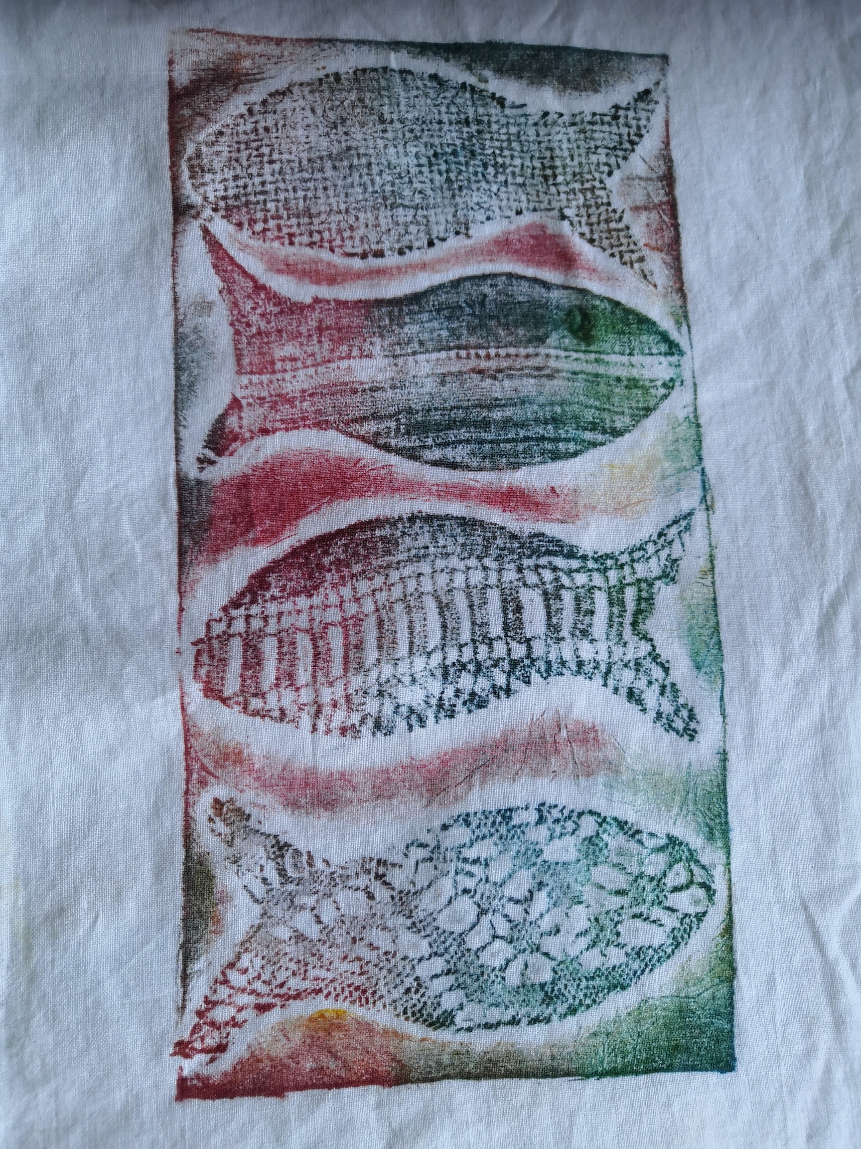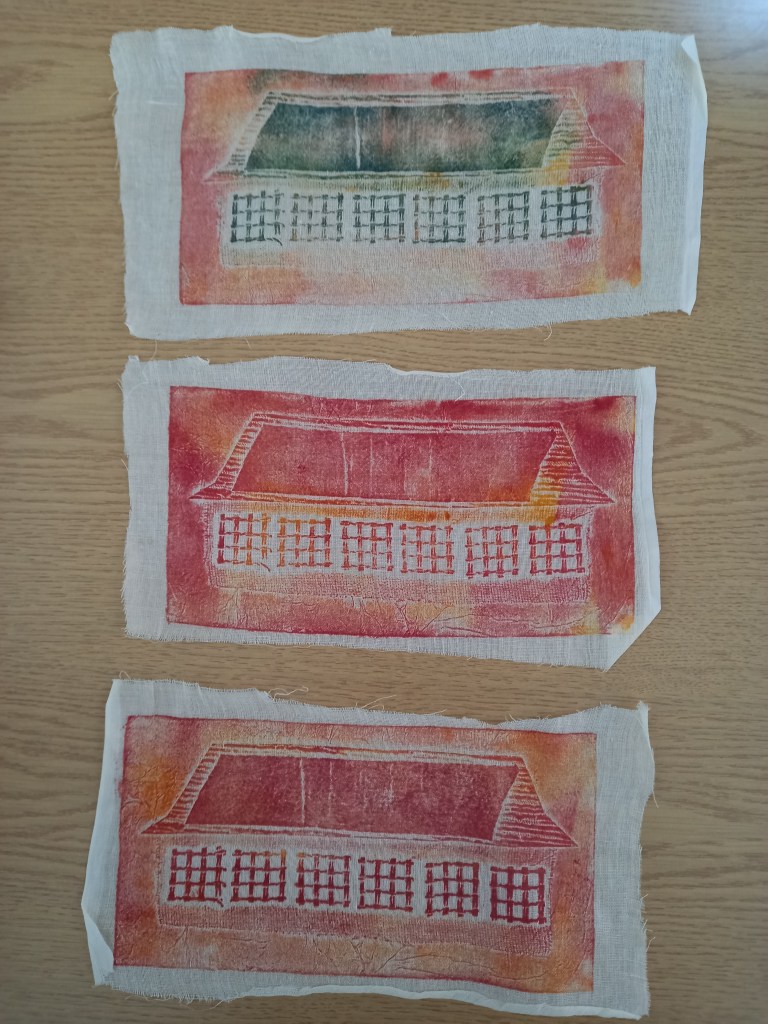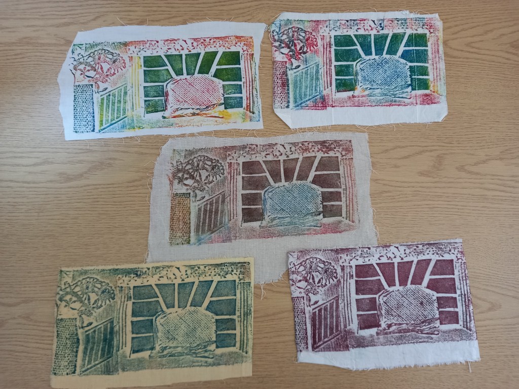 “This collagraph print is based on a photo that Menna ( Lead Textile Artist) took of a floor in the former Cwmgors primary school where parquet flooring used to be. I enjoyed doing it because the pattern was repetitive and geometric, but the textures were varied. We each made a ‘plate’ for printing using pieces of card, wallpaper, fabric, plastics : it was quite messy too with lot’s of gluing and inking involved !The print technique was effective, and it was interesting to see the results. It was also enjoyable doing this activity together in a group, sharing ideas, we had fun!”